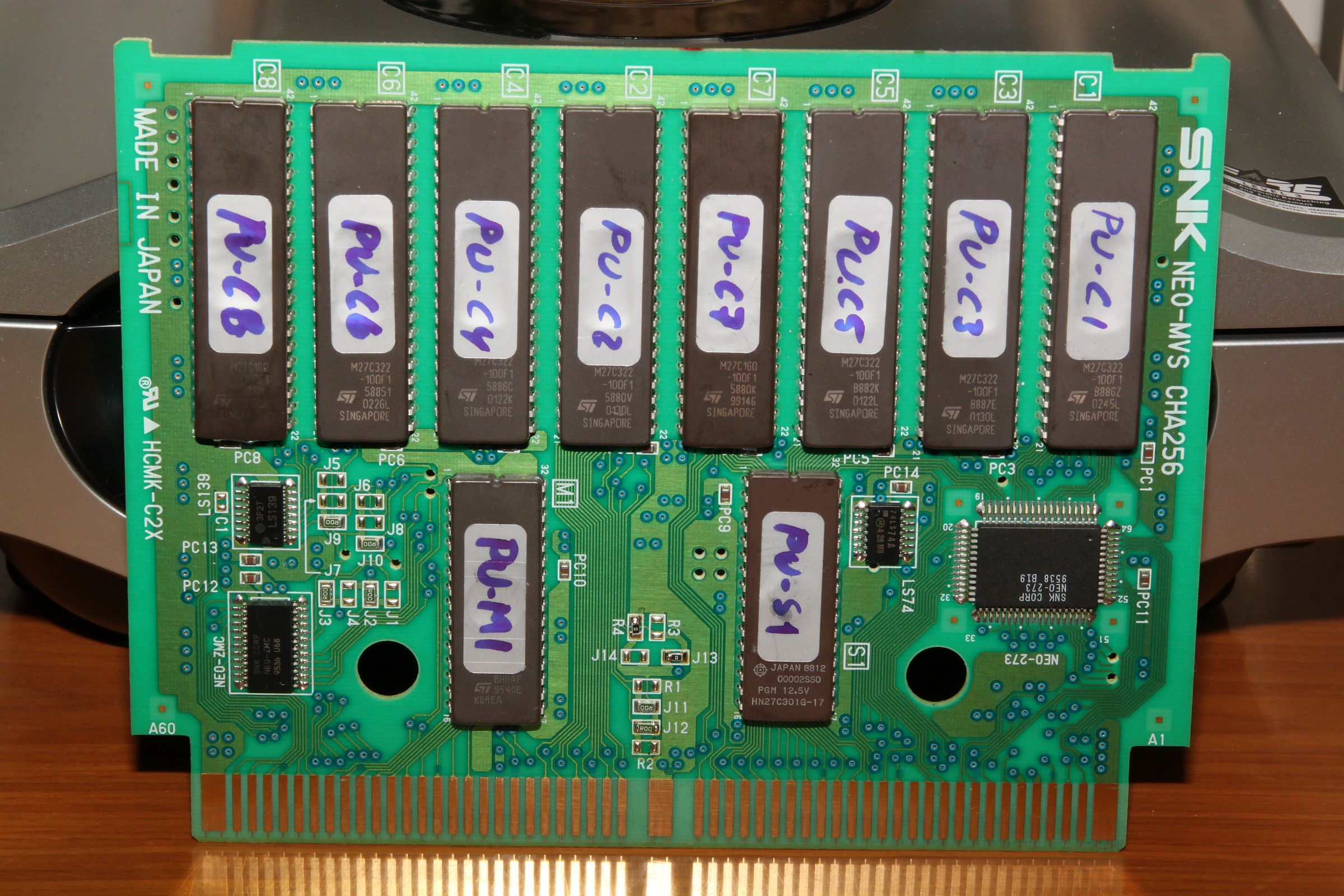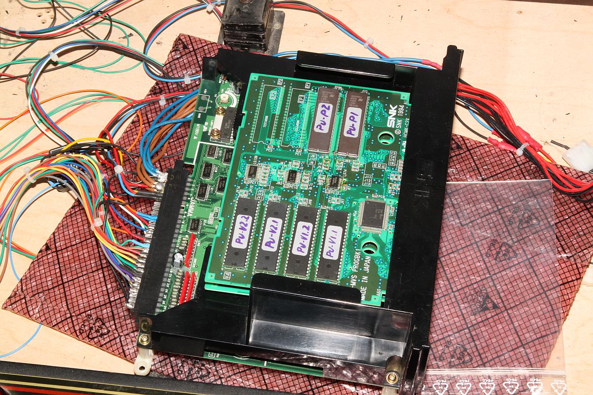 {Jetzt richtig machen...} Also hab ich kurzerhand eine originale Goal! Goal! Goal! geschlachtet, da ist nämlich anstatt einer CHA256B eine CHA256 drinnen. Da muss wohl eine klitzekleine Differenz zwischen den beiden Typen sein... Und komme mir jetzt keiner mit dem "B", der Witz ist alt. Für EPROM P1 habe ich übrigens statt eines 27C800, den ich nicht besitze, einen 27C160 verschwendet. Diese sind im Allgemeinen billiger als die 800er, dafür muss man dann das höchstwertige Adressbit an Masse legen (siehe Foto).