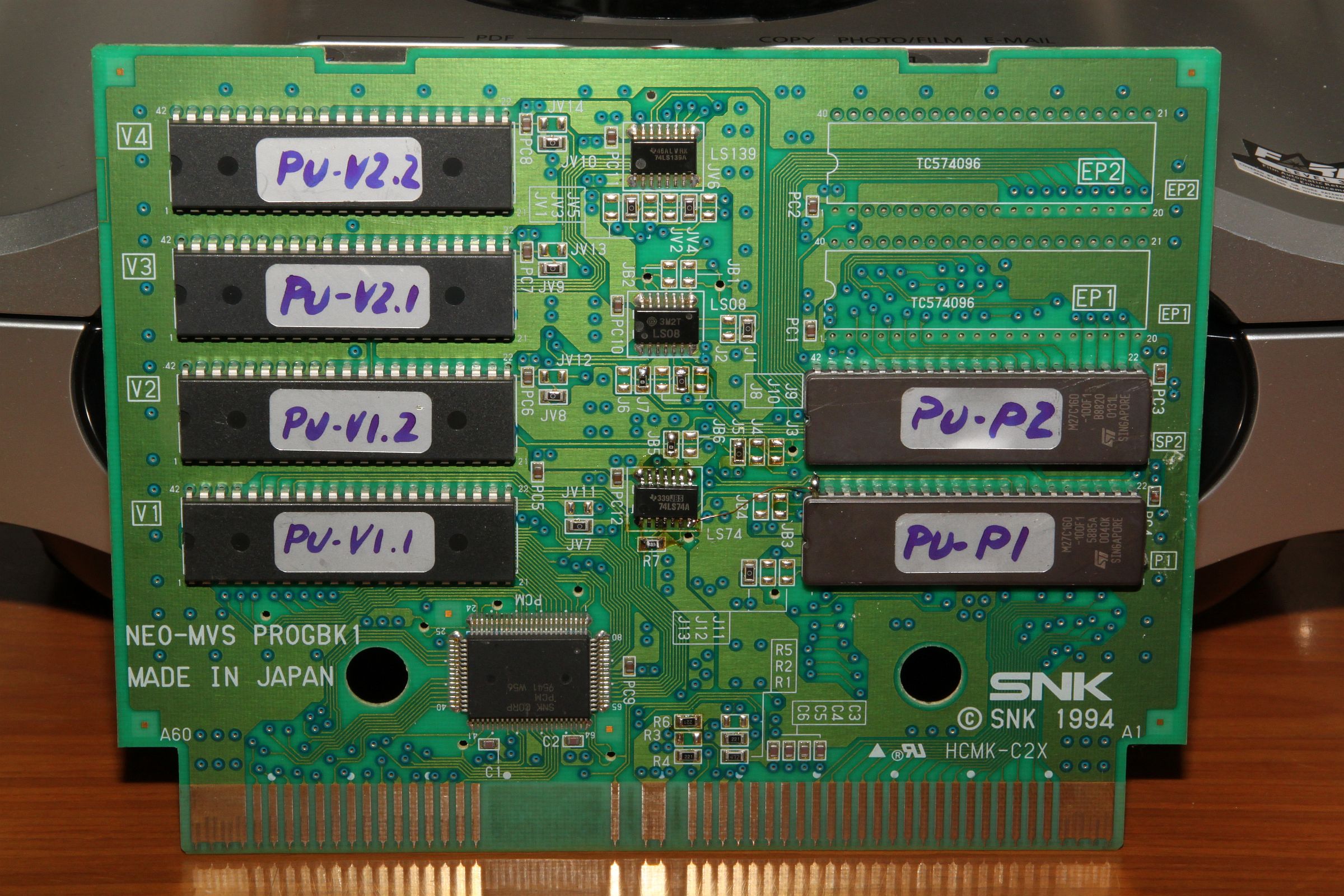 {Pulstar Conversion} Ich will es wissen... Nach Ironclad, Blazing Star, Viewpoint wollte ich meinen Shooterliebling "Pulstar" ausprobieren. Pulstar ist ein echtes EPROM-Grab: alleine die C-ROMs bestehen aus 6 x 27C322 und 2 x 27C160... Da werden die PCBs richtig schwer. Basis für die Conversion sind PROGBK1 und CHA256... Ich hatte es erst einmal mit CHA256B probiert (lag halt gerade da...), obwohl die Jumperbelegung da nicht ganz geklärt ist... Leider war das Ergebnis nicht 100% befriedigend, ein kurzer Teil im Attract-Modus hat Grafikfehler, das Spiel ist sonst aber völlig fehlerfrei... komisch...