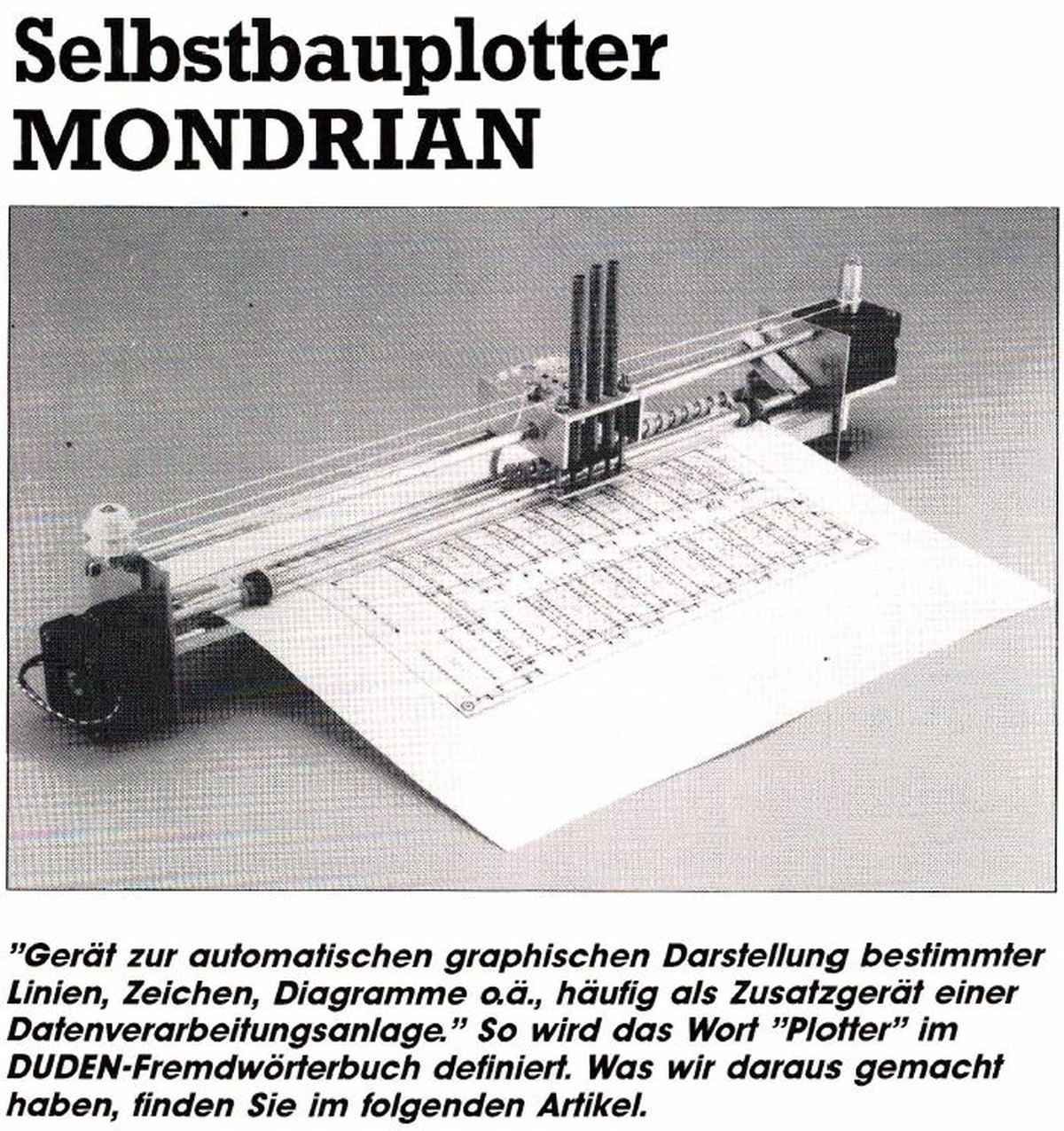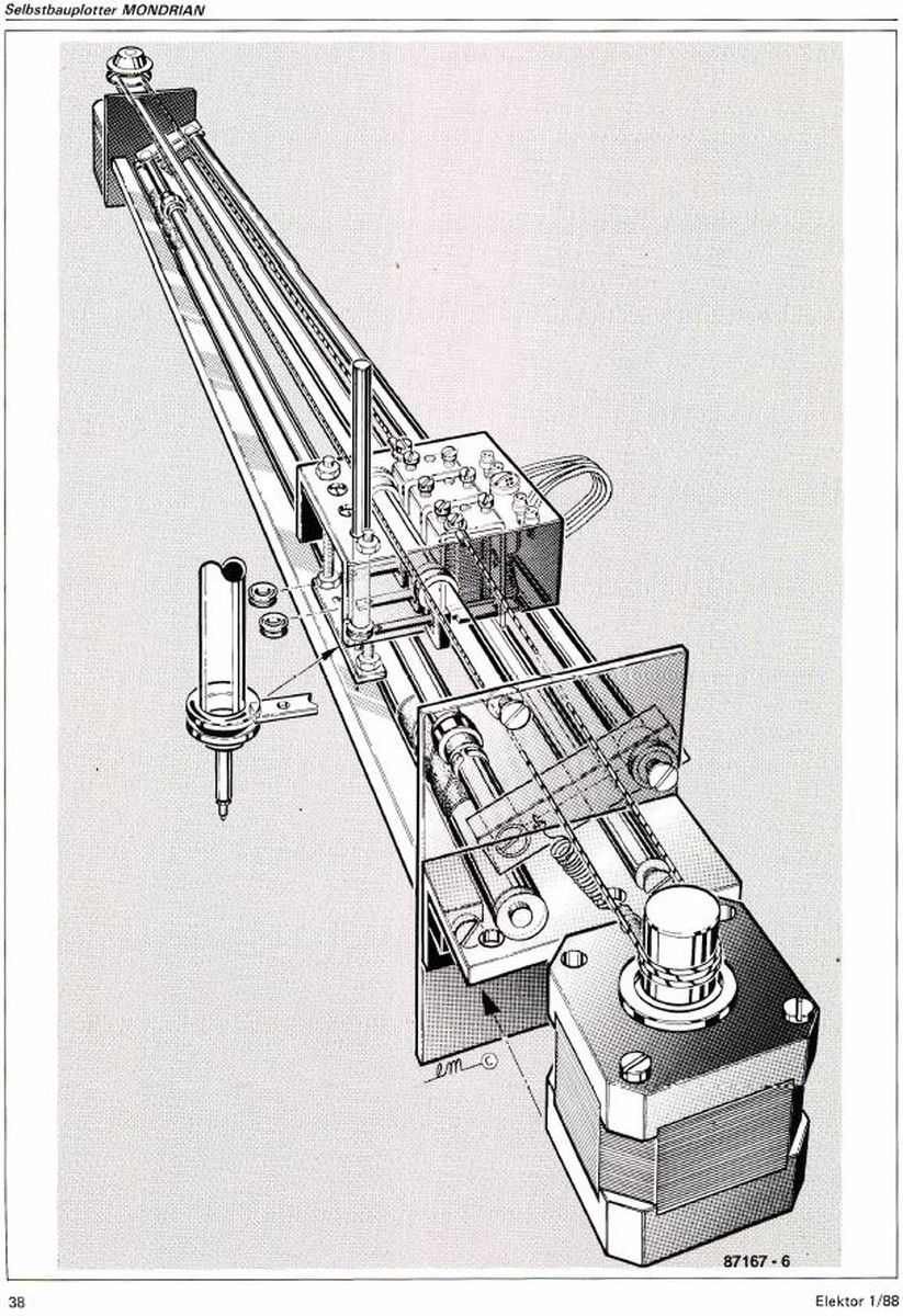 {Elektor Mondrian} Im Jahr 1988 sind viele interessante Dinge geschenen. Ich habe mein Elektrotechnikstudium an der TU Berlin begonnen und Elektor hat einen Bauplan für einen rudimentären DIN A3 Plotter mit drei Farstiften veröffentlicht. Während Ersteres im Desaster endete, hat mich der Elektor-Artikel damals unglaublich begeistert und inspiriert. Leider konnte ich mir die aufwändige Mechanik damals nicht leisten... Heute ist das etwas anders... vor wenigen Tagen ist mir ein Angebot unter die Finger gekommen, zu dem ich nicht nein sagen konnte... Nach nur 35 Jahren wird ein Traum Wirklichkeit. Wir dürfen gespannt sein! {Der erste Aufbau - Fertigstellungen und Optimierungen} Was mir als erstes auffällt, sind die fehlenden Details im Bereich der Papierwalze... Im Elektorartikel genau beschrieben: hier muss was mit gutem Reibungskoeffizienten rein. Am besten ein grobes Schmirgelleinen. Ein Band aus einem Bandschleifer wird dafür geopfert. Es ist ja für einen guten Zweck! Dauerelastischer Schuhkleber und viel Geduld führen zum Erfolg. Das sieht doch schon sehr gut aus... Beim Zusammenbau zeigt sich: die Andruckrollen sind nicht lagestabil - da muss etwas Professionelleres her. Passende Feststellringe mit Madenschrauben... So sieht das aufgefädelt aus: Und so in Aktion. Die Mechanik passt so schon mal perfekt. Auch wenn es sich hierbei um den ersten Mondrian handelt, der im Gegensatz zur Mondrian 2 Variante, die bald danach in der Elektor erschien, noch keine mechanischen Optimierungen aufwies. Trotzdem ist die Konstruktion erstaunlich wiederholgenau! Jetzt fehlt noch die Software, um den Plotter sachgerecht ansteuern zu können... Da frage ich doch einfach mal die Programmierer der originalen Elektor Software an. Die gibt es nämlich noch: Hard- und Software Burkhard Lewetz. |