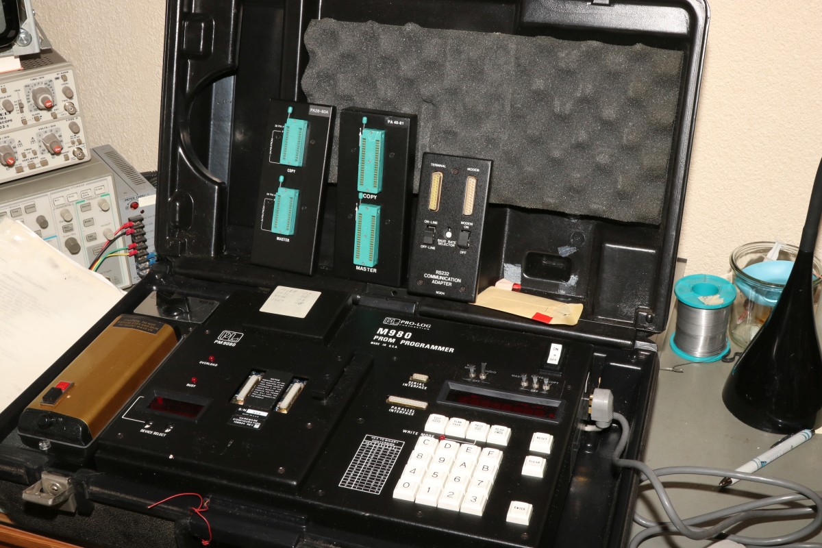{ProLog M980 Programmer} War der M900 noch mit einem schnuckeligen 4004 Prozessor ausgestattet, so punktet der M980 mit dem deulich leistungsstärkeren (hüstel) 4040 Prozessor. Eigentlich nur aus diesem Grund finde ich die ProLog-Programmiergeräte so interessant! Uralte und ursprüngliche Prozessortechnologie! Und hübsche LED-Displays. Die Auswahl der programmierbaren Bausteine (2716, 32, 64) ist hier hingegen eher langweilig. Dafür kommt das Teil wieder mal in einem praktischen Koffer daher: Ein klein wenig verstaubt: Sehen wir doch mal gemeinsam rein: Personality- und Schnittstellenmodule: Das Grundgerät mit Programmiereinsatz: Die Ausrede "EPROM-Löscher vergessen" zählt hier nicht... alles ist mit dabei! Maximale Adresse... ist die Anzeige nicht schön? Device Seleckt hat 2716 selektiert... die verfügbaren Speicherbereiche werden dann automatisch eingestellt. Wie am Kaminfeuer... Das Programmiermodul ist auch mit Logik und EPROMs vollgepackt, da spart man sich beim Typwechsel das Laden neuer Software, es ist nämlich schon alles mit drin! So sieht der Prommer komplett aus: Das Innenleben sieht interessant aus! Für jede Sonderfunktion gibt es ein spezielles EPROM! Das Memory-Board ist Batterie-gepuffert... also, das war's mal... igitt. Irgendwie lecker. Nickel-Cadmium - einen Ersatz wird es da wohl nicht mehr geben... Gottseidank war nichts kaputt! Das Memory-Board in sehr hoher Auflösung --> Klick! Die Speicher sind 2114-Kompatible, 1kx4 RAM Das Memory-Board - Unterseite (auch sehr groß!) Mein Schatz: der Intel 4040. So viele Firmware-Varianten... das ist bis heute nicht besser geworden... Das Baseboard von Unten - hoch aufgelöst: Und weil's so schön ist: das Base-Board von Oben - in sehr großer Auflösung --> Klick! Die Bedienplatine von Unten: Bedienelemente und Displays sind vom M800 übernommen: Die Displays sind einfach schön - viel besser, als schnöde 7-Segment-Anzeigen! Jetzt mal in Betrieb nehmen... Der Test mit 2716 ergibt leider: das Teil liest fehlerfrei aus - die Programmierung funktioniert aber nicht, vermutlich ist hier die Erzeugung der Programmierspannung platt, vielleicht ist es aber auch ganz was Anderes. Wenn ich mal ganz viel Zeit habe, werde ich mich diesem Problem widmen. Vielleicht. |