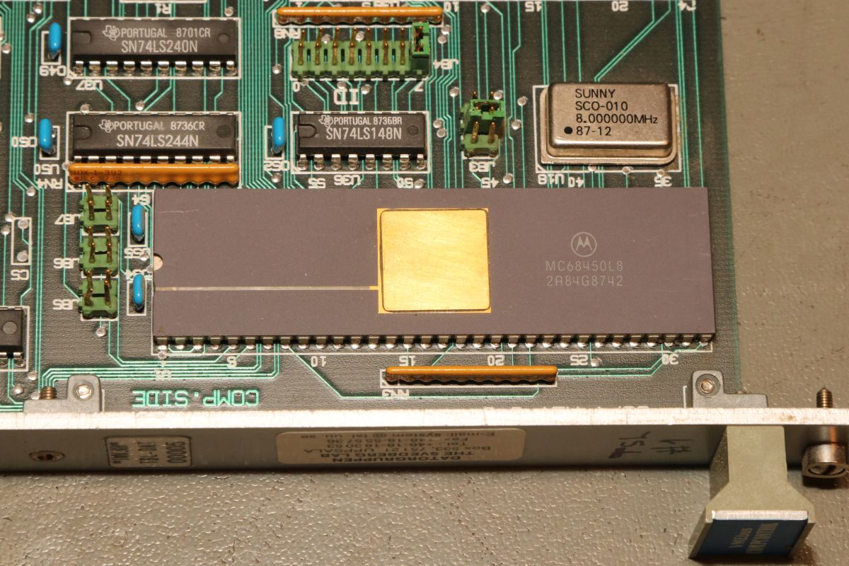 {VME-Bus Leiterkarten im Detail} Uwe aus Uppsala kennt meine Vorliebe für Elektroschrott aus diversen Filmen und hat dankenswerter Weise an mich gedacht, als der Elektroschrottcontainer mal wieder prall gefüllt war. Herzlichen Dank dafür! Heute geht es um den VME-Bus - Versa Module Eurocard-Bus - ein leistungsstarkes Bussystem, welches ursprünglich mal (1981) für den 68000 entwickelt wurde. Im Lauf der Jahrzehnte haben wurde eine riesige Vielzahl an Karten entwickelt, mittlerweile für alle gängigen Microprozessoren. 1981 spielte ich noch mit meinem Plastik-ZX-81 und ahnte nichts davon, dass es tausendfach leistungsfähigere Computersysteme in der "ernsthaften" Rechen- und Steuerungstechnik gab... Das war vielleicht auch gut so. Aber nun mal im Detail!