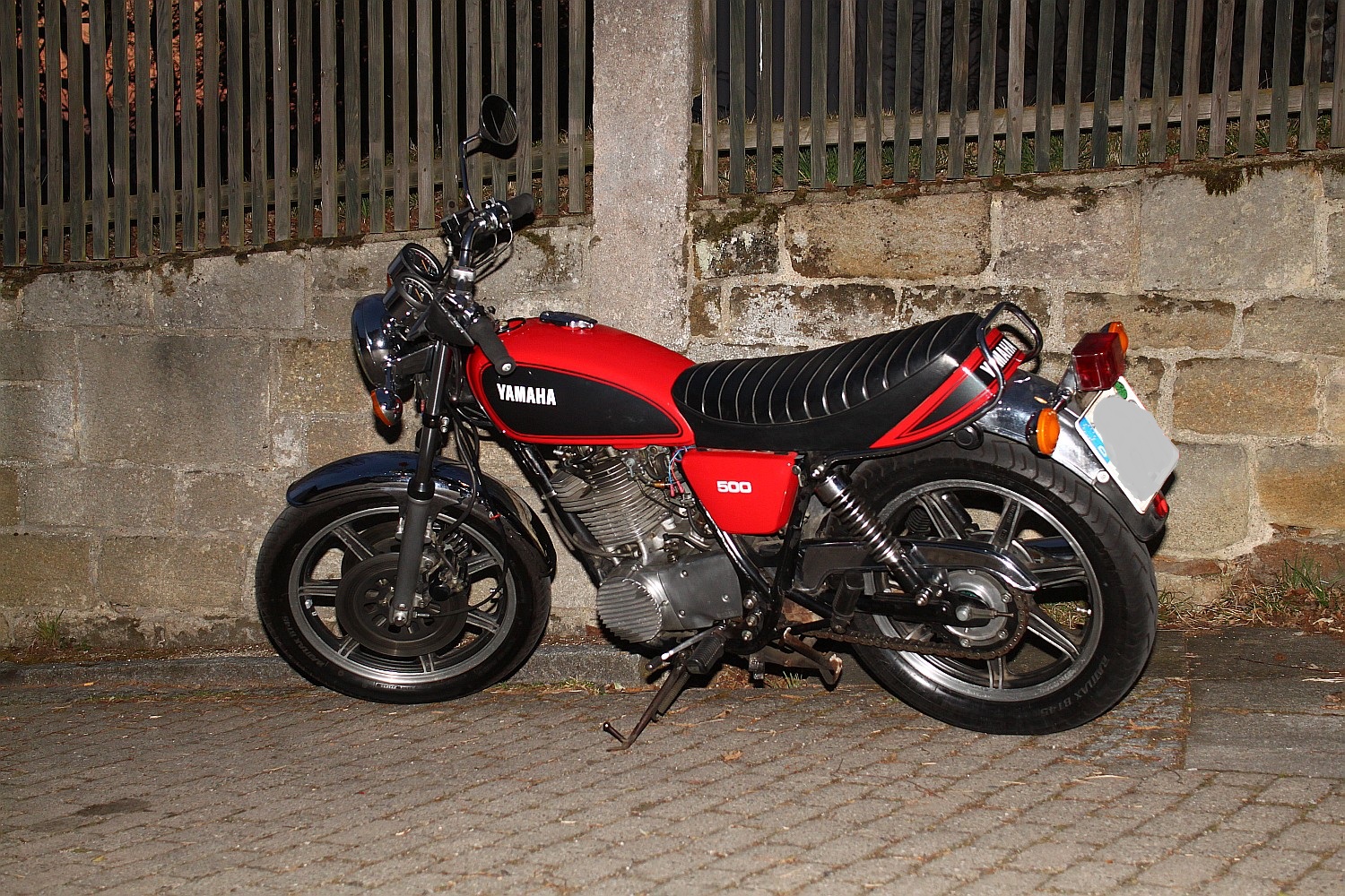 {Meine Yamaha SR-500} Baujahr 1979, 1 Zylinder 500ccm, 4-Takt. Zwei Ventile. Also alles, was ein Motorrad braucht. Mittlerweile hat mein Schätzchen 103.000km auf der Uhr, mit dem ersten Motor, aber zweiter Übergröße. Die folgenden Bilder zeigen noch das 1996er Tankdekor "Miyabi Maroon". Mittlerweile habe ich einen gebrauchten Tank und Seitendeckel auf 1979er Dekor umlackieren lassen. Das ist einfach originaler ;-)