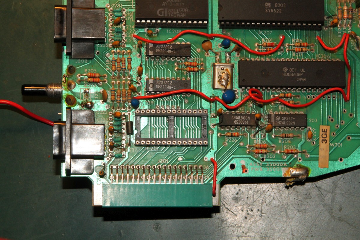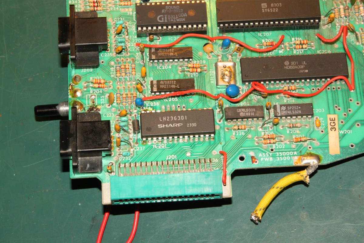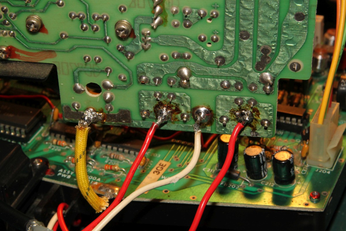 {Fehlerbeschreibung} Kunde... Vectrex... geht nicht... Drama... Aber das ist kein adäquater Vectrextransportkarton: Nach dem Auspacken sieht das Gehäuse schon mal blöd aus: Nach dem Öffnen fallen mir diverse Kuststoffteile entgegen. Ein stabiler Karton wäre sicher eine gute Idee gewesen. Einmal mit dem Multimeter messen enthüllt: die Sicherung ist durch. Ausgetauscht und ... Geht. Leider kein Ton und die Vektoreinstellungen muss ich auch alle nachregeln... Erstmal Mechanik... ich bin da ganz eigen, es mus für die Ewigkeit halten, daher scheidet Sekundenbäpp grundsätzlich aus, außer zum fixieren der abgebrochenen Teile: Hier hilft nichts mehr, da fehlen die Krümel... Ein alter Filzmarker und UHU Plus geben die nötige Stabilität: Die Hülsen werden mit dem Heißluftfön auf die nötige Weite gebracht und auf die Stutzen gesetzt... Hier ist der Spalt zu sehen, der gleich mit Epoxydkleber gefüllt wird. Keine Angst, das Zeug kriecht langsam aber sicher da hinein... Und fertig: ![]() Schweinkram, elendiger... Also: Den ROM-Sockel musste ich komplett entfernen, die empfindlichen Vias waren teilweisse rausgerissen und auf beiden Seiten löten geht nur direkt am IC... Das angeknabberte Stromkabel hab ich mal aus Sicherheitsgründen professionell geflickt: Der Aufwand war enorm, die Ursache des Schadens sinnlos. Aber die Vectrex lebt wieder! Für die Interessierten Leser: die Vectrex CPU-Platine in voller Auflösung: ![]() |